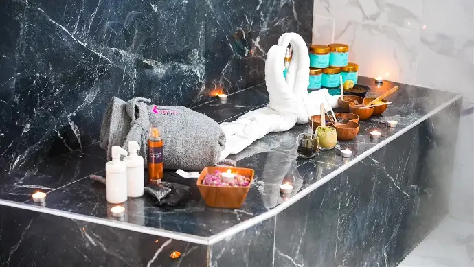 مع تريتمنت وسشوار للشعر و نوعين سنفرة و 5 خلطات للجسم عبارة عن خلطة النيلة المغربية وعكر فاسي وخلطة بياض التلج الخاصة بالصالون وخلطة الكركم لتوحيد لون الجسم وخلطة المرة